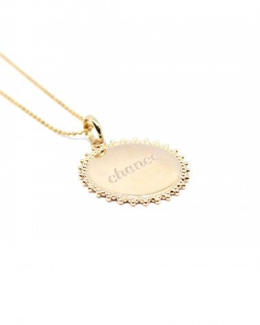 Add to cart Prix 85,00 € CHANCE Médaille fantaisie, plaqué or 24 carats. Médaille irrégulière taille : 2 cm *Tous nos messages sont gravés en minuscules, exceptés les prénoms....
